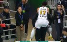 双方第一节比赛,还有5分39秒时,广厦队7-16落后山西队9分,此时,孙铭徽持球快速冲到篮下,想打一个快攻,然而,冲进禁区内上篮,孙铭徽却突然倒在地上,显得十分痛苦,只见他的双手捂住了自己的脚,显然,在突破的时候,他出现了崴脚的情况……随后,队友也是过来给他进行一个简单治疗,接下来,只见孙铭徽依然是没有办法起身,最终,孙铭徽被队友直接背出场,提前结束了本场比赛。显然,这是一件让人感到遗憾之事。从孙铭徽的情况来看,可能是不太妙,让人十分担忧!在此,也是希望孙铭徽不会有大碍,可以早日康复,早日回到篮球赛场。